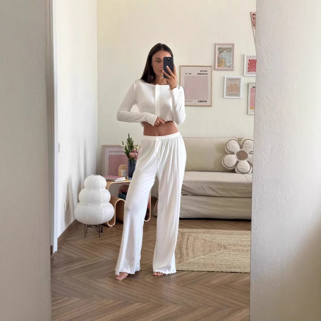 新しい夏のパジャマ、ニット中空ジャカード長袖ズボン、快適で柔らかい女性用ホームウェア、ヨーロッパとアメリカで屋外で着用可能
