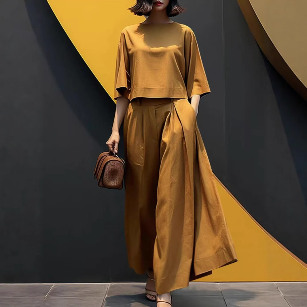 Amazon 2025 越境貿易レディース春夏人気スリム無地半袖 + リラックスワイドレッグパンツスーツ