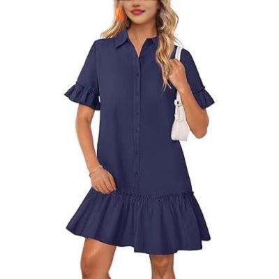 2025 女性の新しいアマゾン夏ボタンダウンシャツドレスカジュアルフリルスリーブストレートミニジャンプスーツ