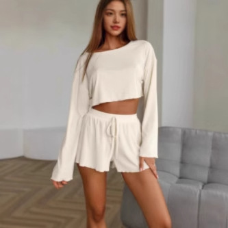 クロスボーダー 2025 夏の新スタイル快適なニットピットストリップ長袖ショーツ外国貿易パジャマセットクロスボーダーホームウェア女性用