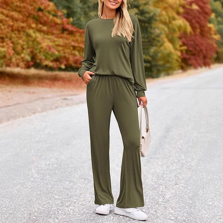 新 2025 女性の 2 点セットラウンドネック長袖トップワイドレッグロングパンツカジュアルセットスポーツウェアホームウェア