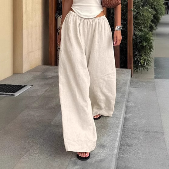 ヨーロッパとアメリカの2025年クロスボーダー春夏通勤レイジーコットンとリネンのニッチファッションワイドレッグパンツルーズポケットカジュアルパンツ婦人服