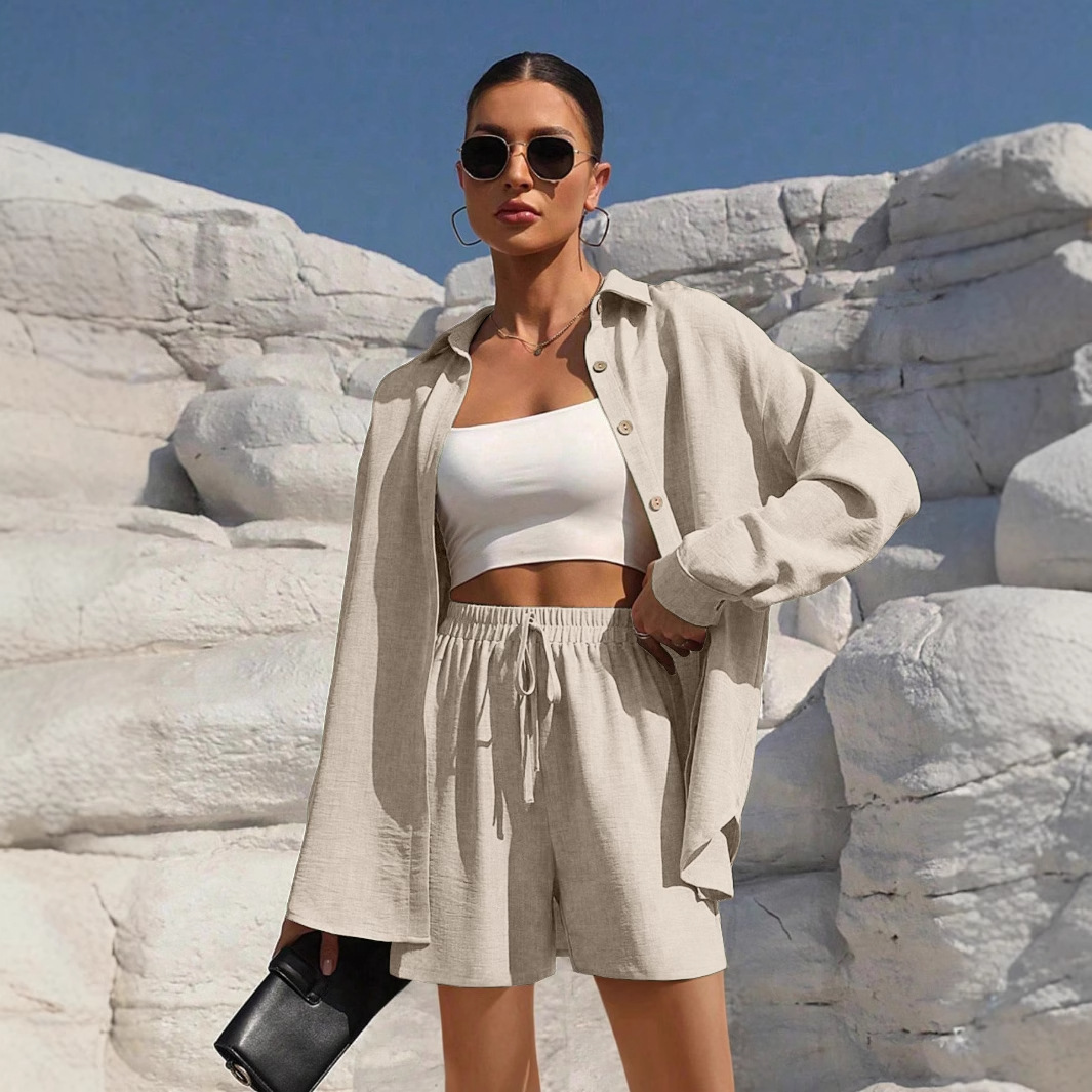 ヨーロッパとアメリカのクロスボーダー婦人服 2025 夏無地ラペル長袖シャツ弾性ハイウエストショーツレースアップカジュアルスーツ