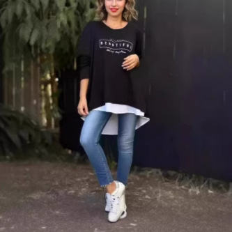 新しい 2025 独立したクロスボーダー秋冬ファッション婦人服ラウンドネック偽ツーピースバックボタンレター長袖トップ