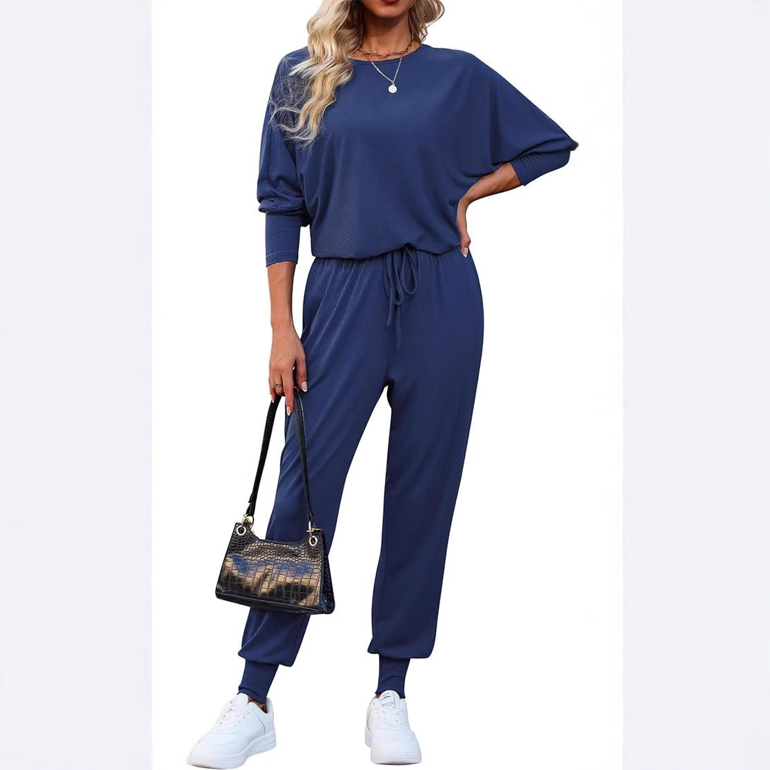 2025 Amazon レディース ツーピース リブニット カジュアル スーツ 長袖 バットスリーブ マッチング セット ポケット付き