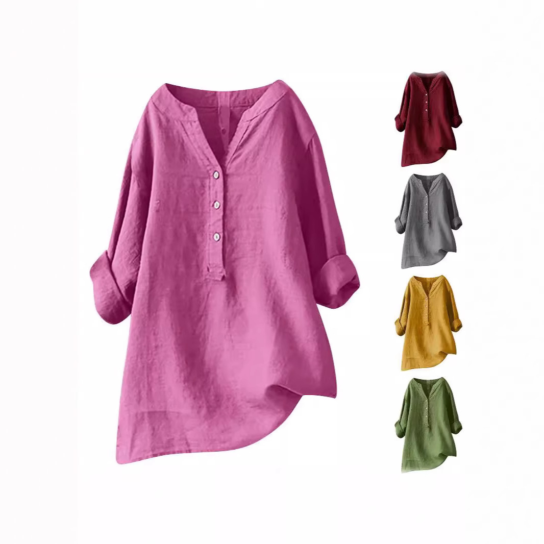 Amazon 2025 夏スポット ebay AliExpress ヨーロッパとアメリカのルーズ無地シャツ綿とリネントップポケット婦人服