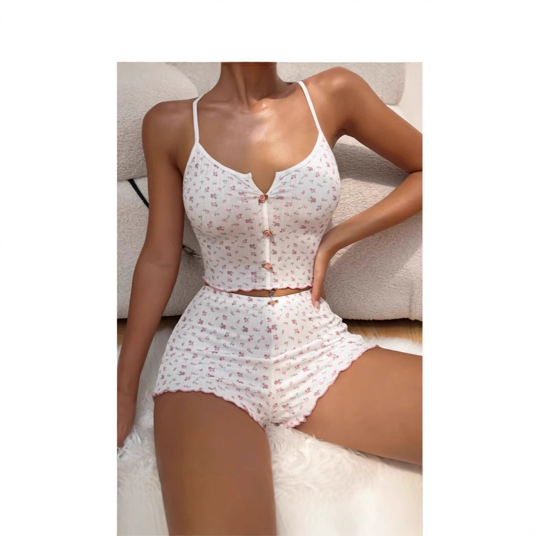 クロスボーダープリントパジャマホームラブサスペンダーショーツカジュアルかわいい弾性ピットストリップクロスボーダーレディースホームウェア