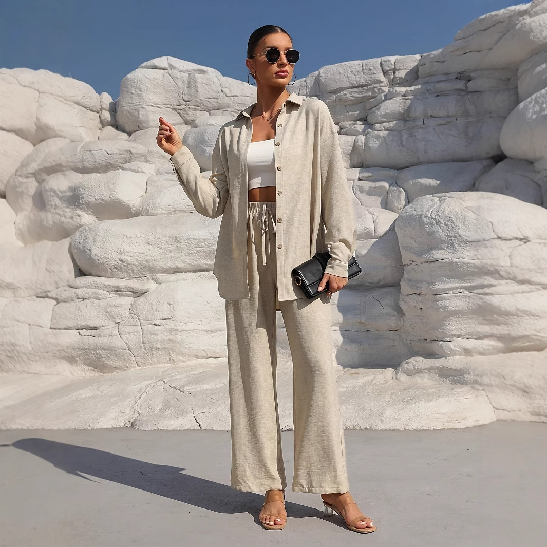 国境を越えた貿易ヨーロッパとアメリカの服春無地ラペル長袖シャツ弾性ハイウエストショーツファッションカジュアルスーツ