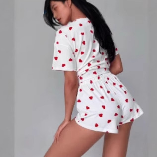 クロスボーダーヨーロッパとアメリカのスリムな新しいパジャマ甘いホットガールラウンドネックラブプリントソフト半袖女性のホームウェアカジュアルウェア