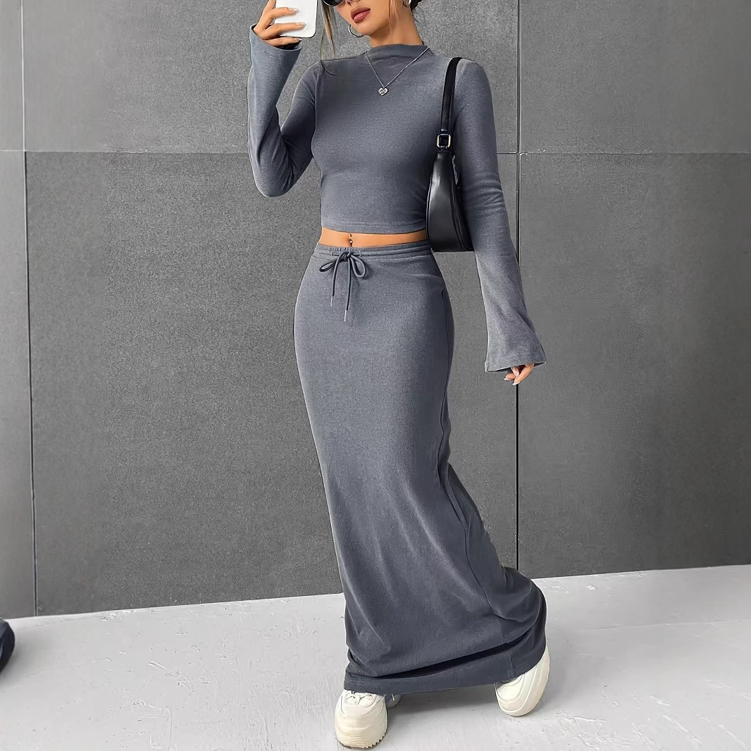 ヨーロッパとアメリカのクロスボーダー2025レジャースーツレディース春秋人気無地長袖スリムフィットヒップカバーロングスカートスーツ
