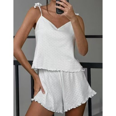 春夏ヨーロッパとアメリカの2025新しいニットジャカードパジャマ通気性サスペンダーショーツ2点セット白い女性のホーム服