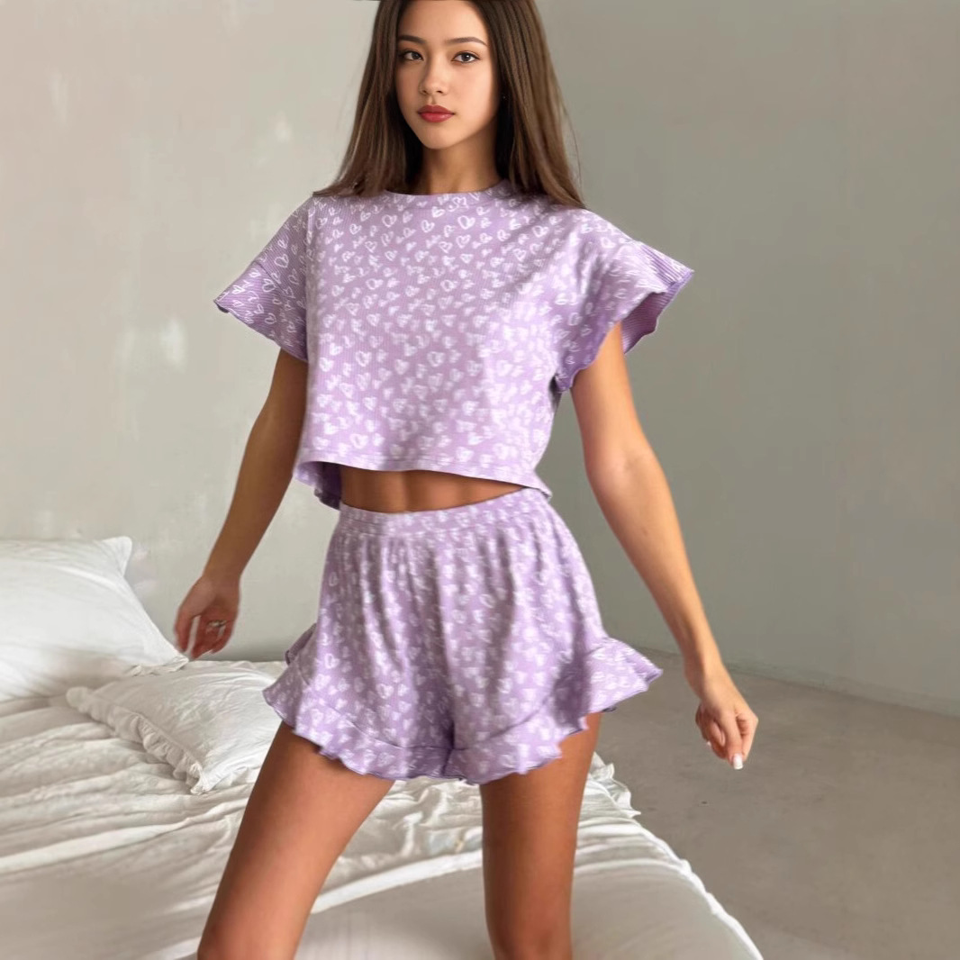 ヨーロッパとアメリカの新しいクロスボーダーファッショナブルで快適なパジャマは、フリル付きの長袖ショーツスーツの外で着用できます。