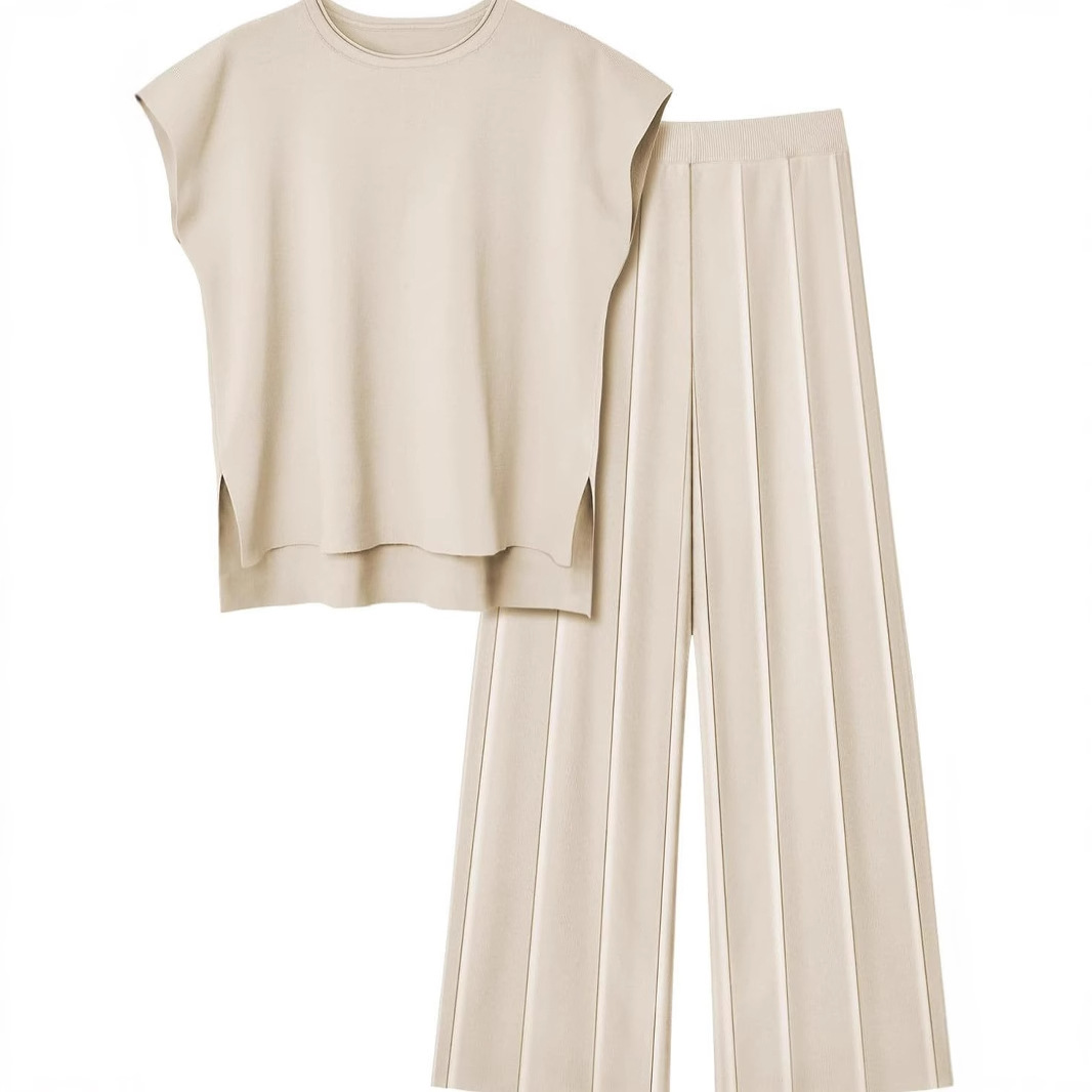 新しいアマゾン 2025 ヨーロッパとアメリカの女性のニットカジュアルスーツノースリーブベストセーターワイドレッグパンツ 2 点セット
