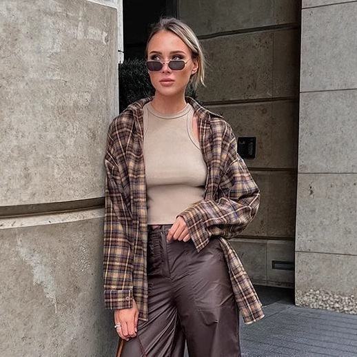 2025 ヨーロッパステーションクロスボーダー春レトロチェック柄シャツレディースロングデザインボトムチェック柄ルーズシャツ