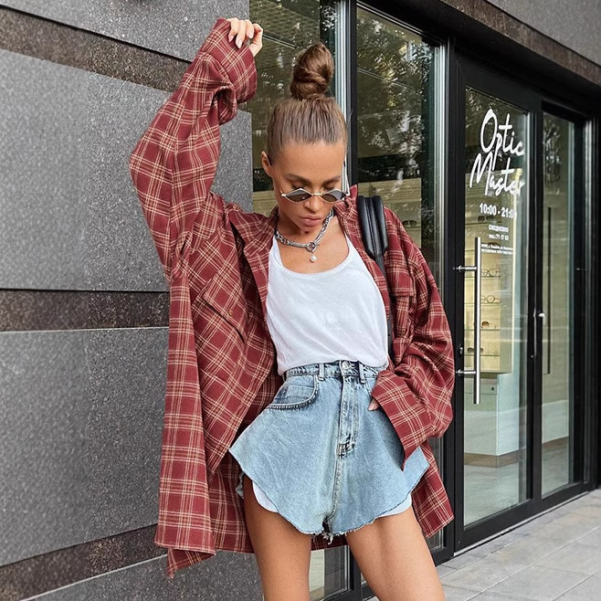 ヨーロッパとアメリカの貿易 2025 春と秋の新しい赤いチェック柄のゆったりとした多用途のカジュアル長袖シャツトップス女性のシャツ