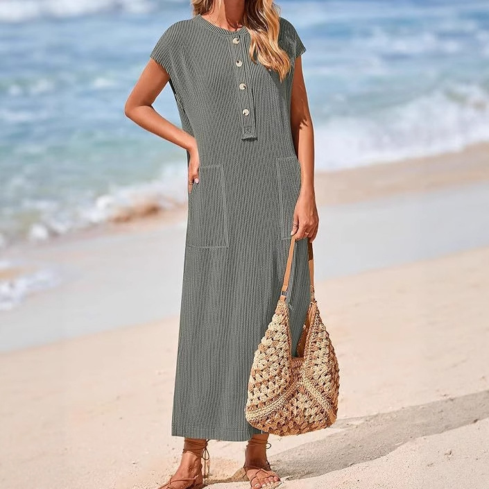 新しい 2025 アマゾン夏リブニットヘンリー半袖マキシドレスボタンルーズスプリットスカート