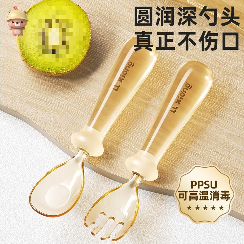冷たい熊の赤ちゃんの元宝のスプーンの子供の赤ちゃんは自主的に食事をして食事をします。