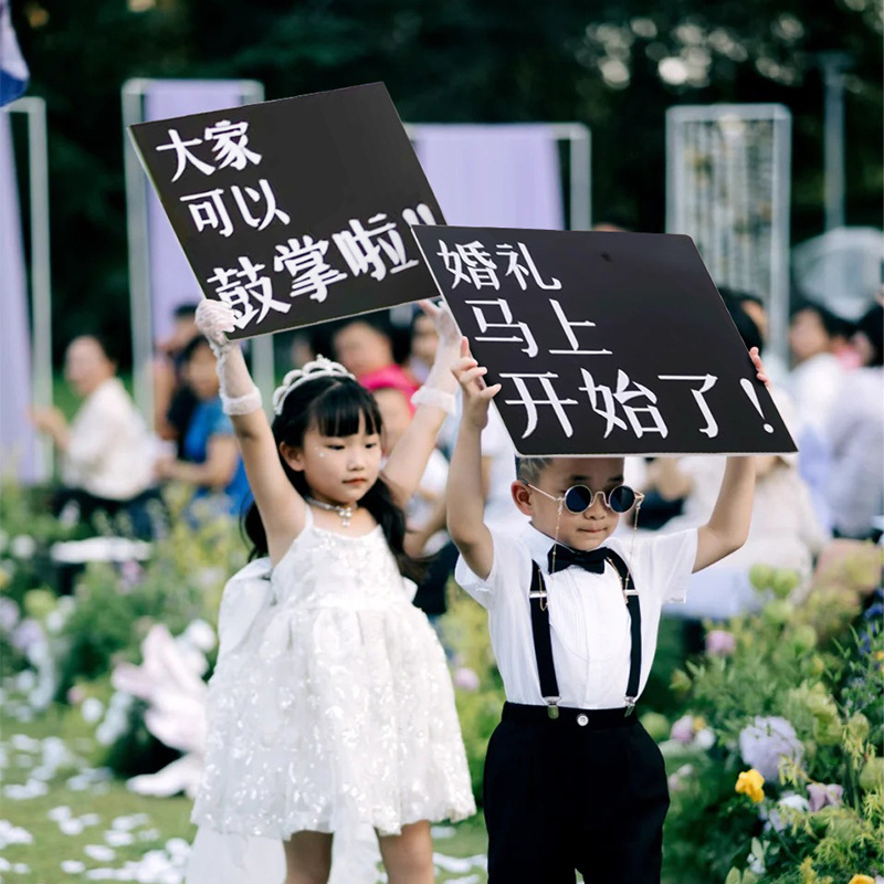 聞派の結婚手が看板を掲げて屋外芝生の結婚式現場の雰囲気を飾って写真を撮ってカードを持って道具を持っている