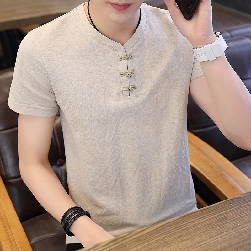 唐装男性半袖tシャツ夏潮新中国式綿麻復古盤ボタンゆるい男性半袖中国風漢服