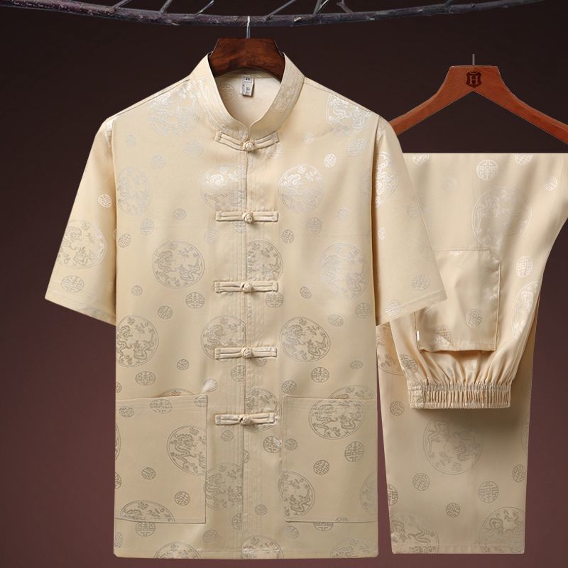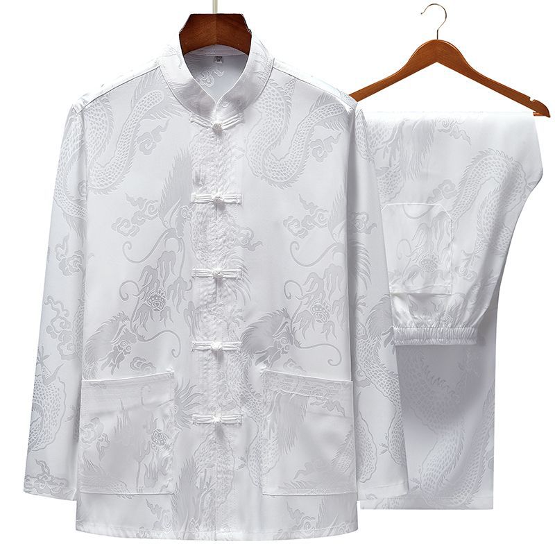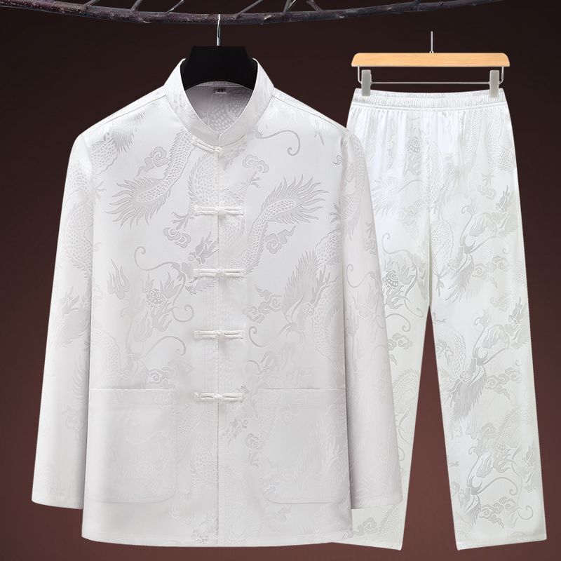 新中国式唐装男中高齢者春夏氷糸長袖セット盤龍紋祖父装漢服太極服
