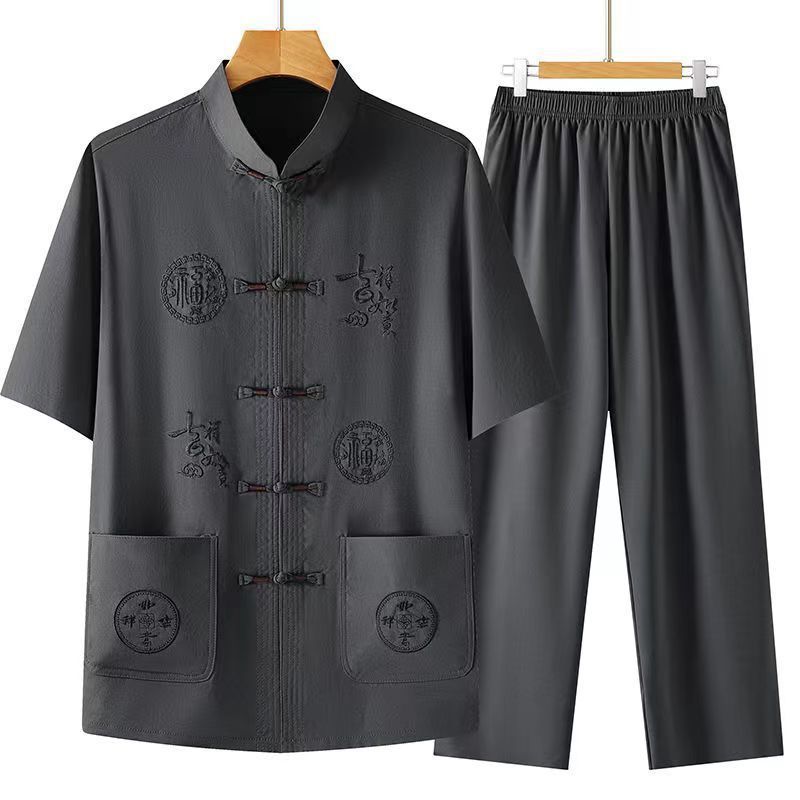 老人唐装男氷糸長袖夏の中高年誕生日おじいさん装中国風お父さん春秋セット