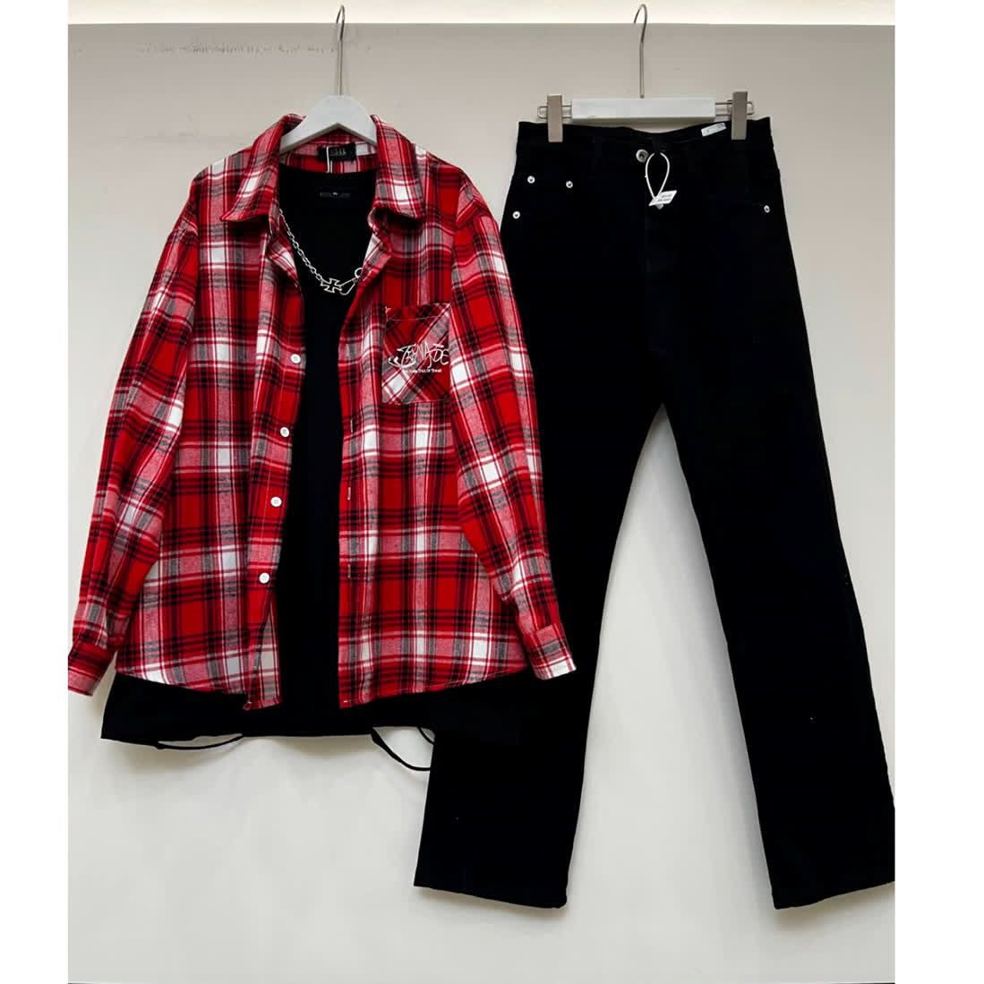 国の潮のブランドのアメリカの高い街のhiphopの格子のシャツの男性の春秋の新型はまっすぐな筒のマイクロラッパのジーパンのスーツを配合します。