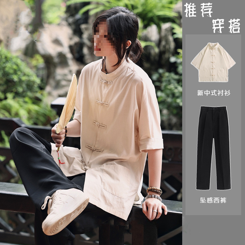 新中国式シャツ中山服男女タイプ夏麻綿中国風復古五分中袖シャツ唐服セット