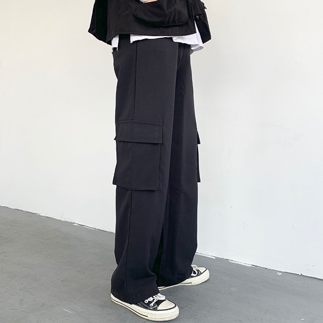 夏の薄いタイプのワイドパンツの男性の香港風の多いポケットの工装のズボンのゆったりしているストレートパンツの韓国版の潮流は男女を合わせます。