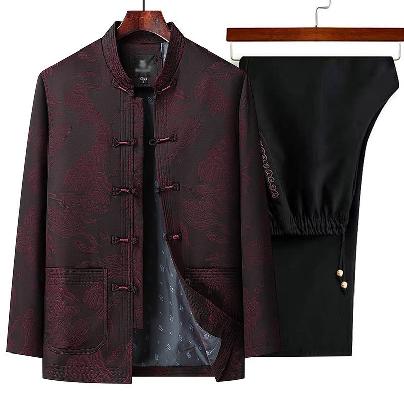 中高年のお父さんは春秋のジャケットの唐装の男性の中国風の漢服のコートのおじいさんのカジュアルな老人のスーツを詰めます。