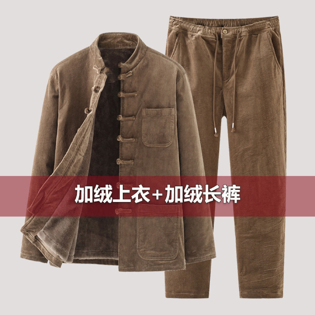 コーデュロイ民族唐装盤バックル厚手セット中国風冬保温コートベルベット中国風復古服