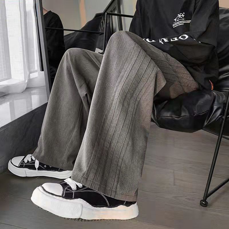 潮牌ins高街レトロ水洗いして古い広脚ジーンズ男ゆるいストレートカジュアルズボン黒
