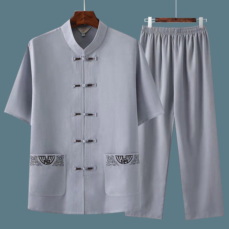 中高年のお父さんは夏の薄い半袖の唐装の民族風の刺繍の2つのセットの中年の男性の屋外のスーツを詰めます。