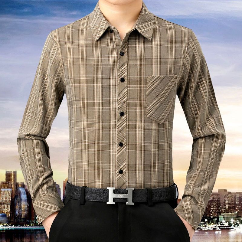春と秋の格子のシャツのの新型の中高年の紳士服のシャツの長袖のカジュアルなパーマのゆったりしているお父さんの服