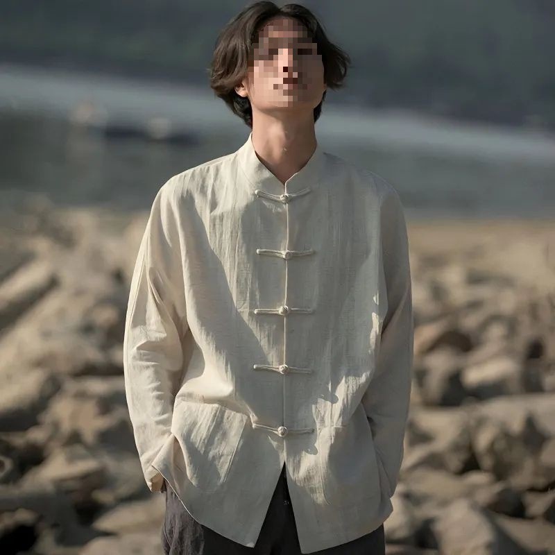 唐装男潮牌復古青年中国風亜麻シャツ長袖綿麻中華立襟中山シャツ服民