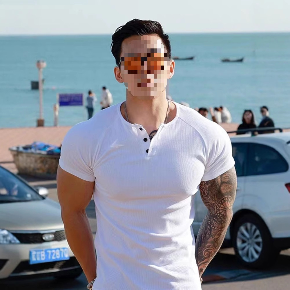 粗糸半袖メンズサマースポーツスリムヘビーウェイトヘンリーシャツアメリカン通気性カジュアルストレッチレトロTシャツ