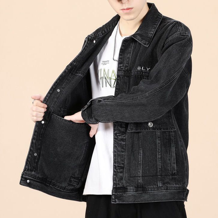 黒刺繍デニムジャケットメンズルーズジャケット秋の新作カジュアル大きいサイズデニムワークウェアジャケット