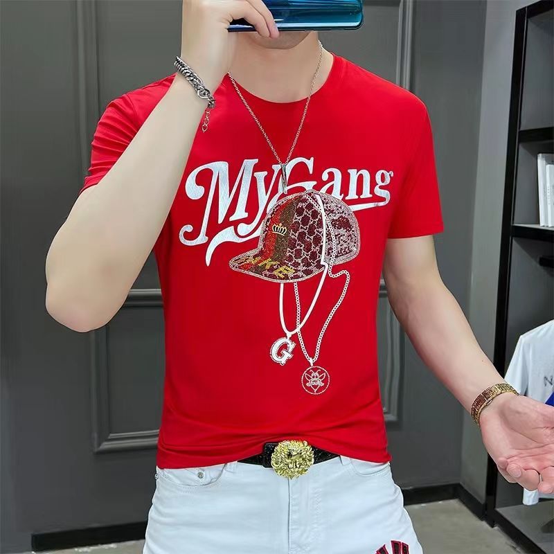 Tシャツメンズ半袖トレンディな夏薄いインターネット有名人ホットダイヤモンド帽子メンズアイスシルク通気性ラウンドネックシャツ