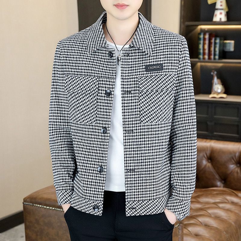春秋メンズコート韓国版新作チェック柄ジャケット若者ファッションオールマッチラペルコートスリムトップ
