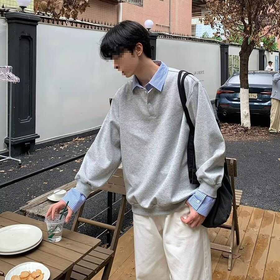 偽の2枚のpoloシャツの男性の秋冬の衝突色は襟の長袖の韓国系をつなぎ合わせてinsTシャツの底のシャツを着ます。