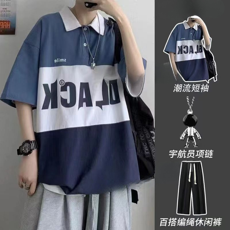【三点セット】衝突色襟アメリカpoloシャツセット男性港風アルファベットプリント潮牌ゆるい五分袖