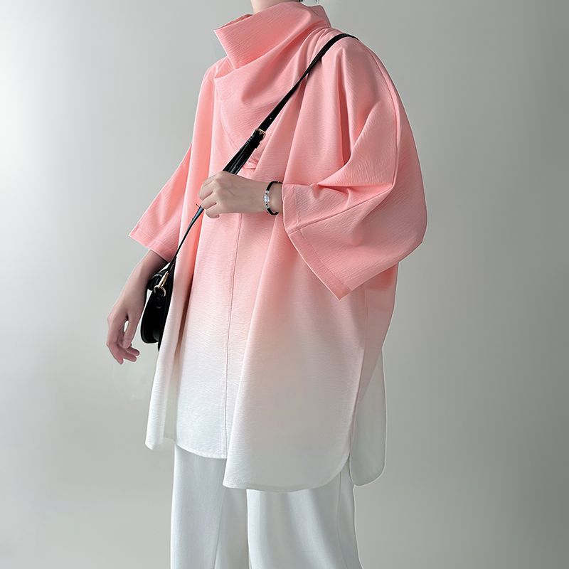 ピンクのグラデーション色の七分袖tシャツ男の夏のスタイリストのごろつきがかっこいいです。