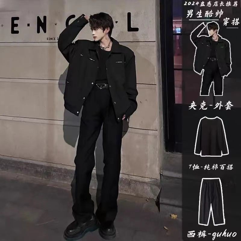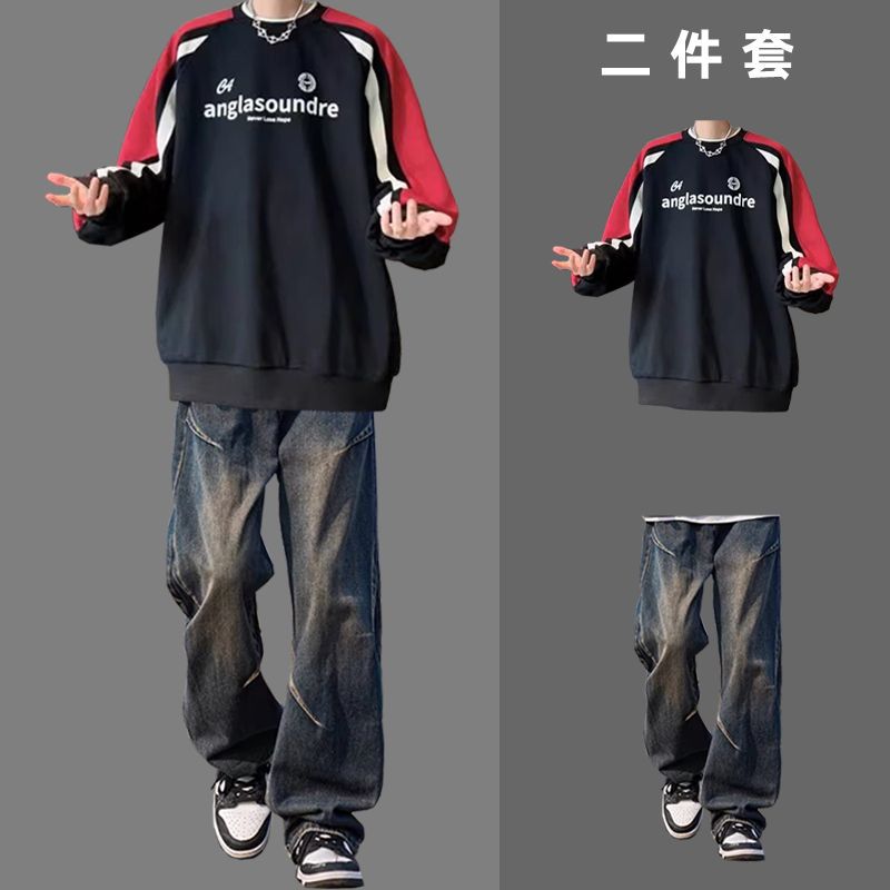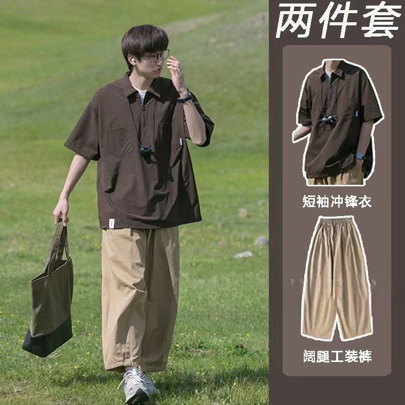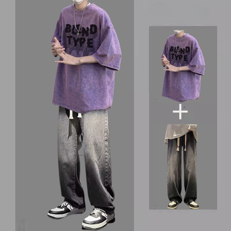 半袖スーツ男夏トレンドレトロtシャツメンズ一枚セットハンサム2点セットグラデーションジーンズ