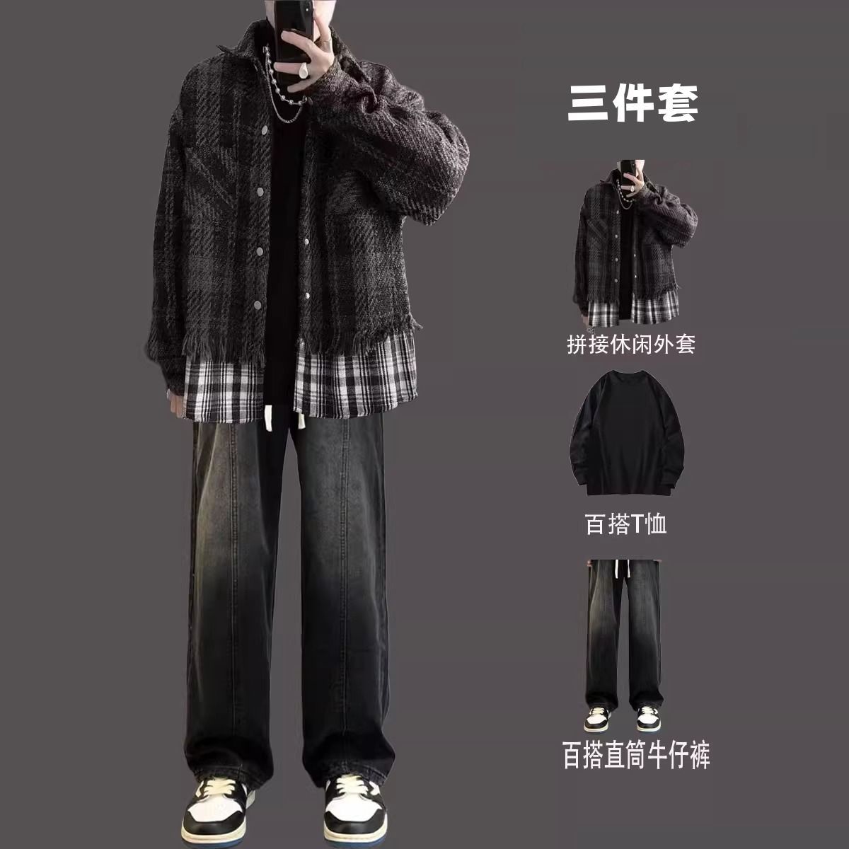 偽二枚の小香風格子コート男春秋スーツ韓国版感潮牌ジャケットと三点セット