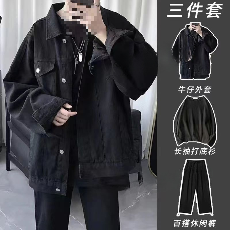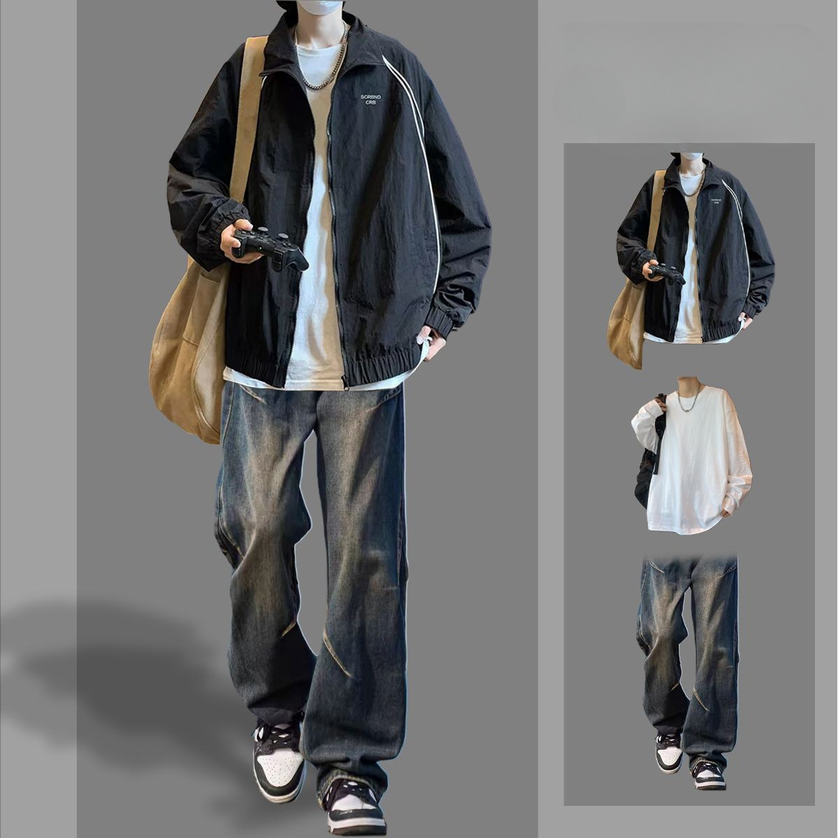 春秋立襟ジャケットセット男子香港風insゆるいカジュアルコート潮牌突撃服格好いい三点セット