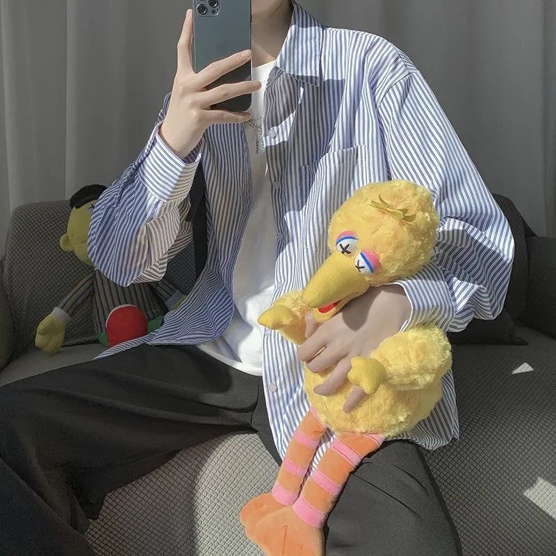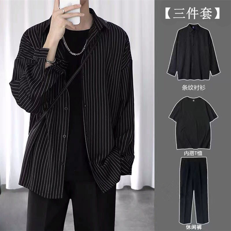 新型ストライプシャツ香港風日系レトロゆるいカジュアルシャツ男性ハンサム長袖青白ストライプシャツ