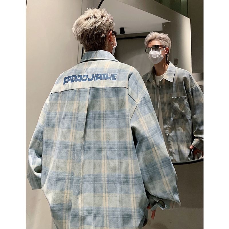 青いカジュアルな格子のシャツの男性の春と秋の日本のシャツのコートのゆったりした長袖の男性のごろつきは格好いいです。