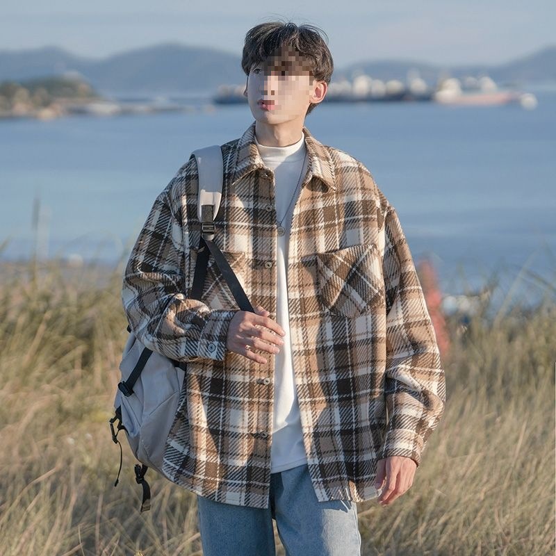 格子毛のコート男insシャツジャケット上着男子春秋金2024年レジャー風登山少年
