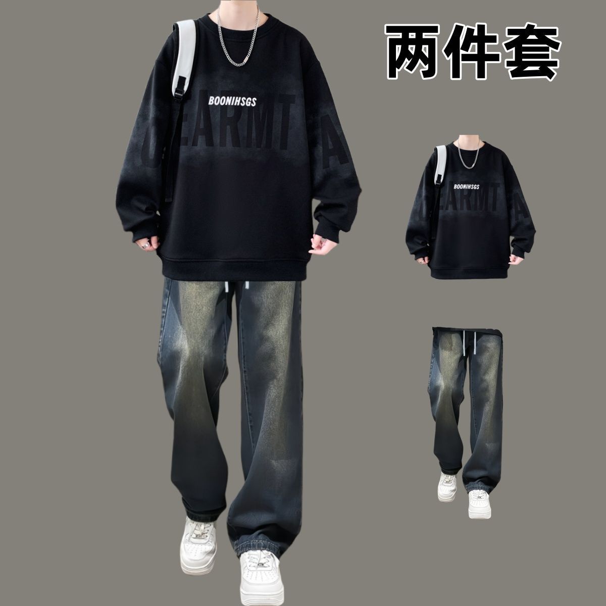秋冬のファッションブランドのプリントの服のスーツの男性の青少年の1セットはジーパンの紳士服の学生の2セットを配合します。