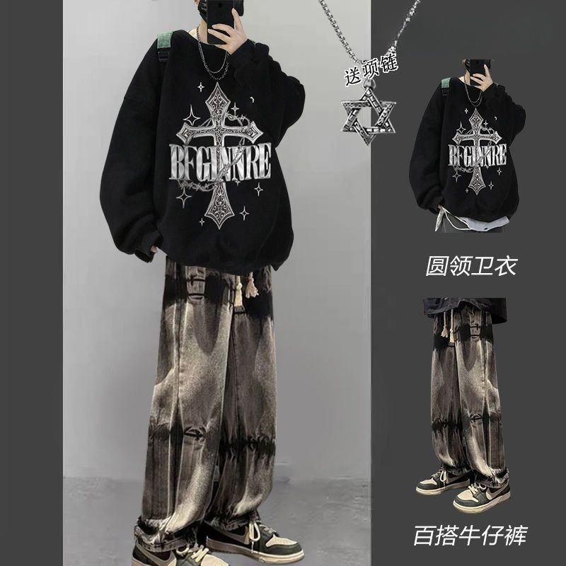 秋のファッションブランドのガードルのスーツの男性の格好いい組み合わせの高い街のジーパンinsは香港風の学生の3つのセットを厚くします。