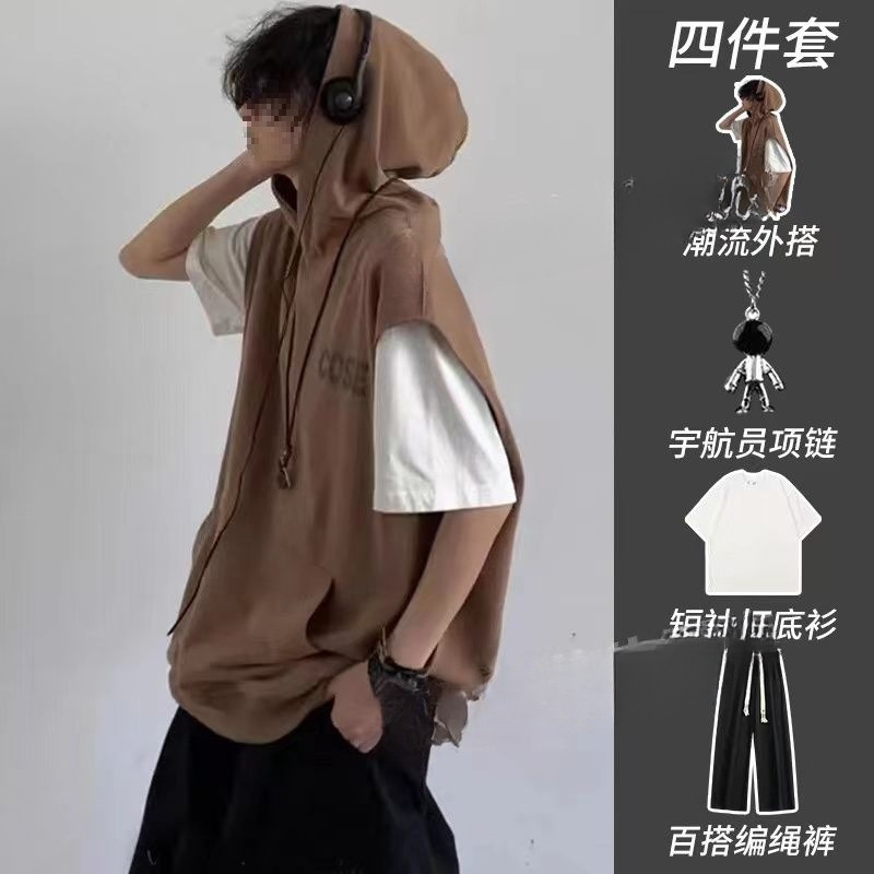 夏の日本系レトロな帽子とアルファベットのプリントベストセット男性とファッションブランドのカジュアルなズボンの現物香港風綿